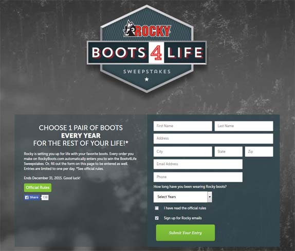 TIMING: Rocky Boots For Life Sweepstakes ends on December 31 at 11:59:59 p.m. EDT.