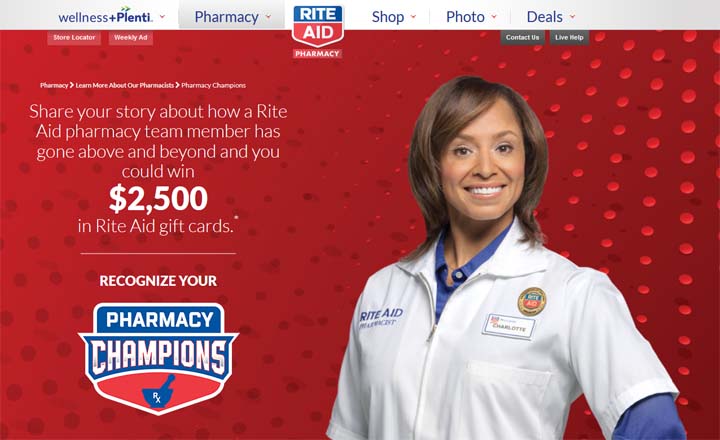 Consumer Grand Prizes [Two (2) – one (1) winner who nominated a Rite Aid Pharmacy Technician or Wellness Ambassador and one (1) winner who nominated a Rite Aid Pharmacist]: Consumer winners will receive $2,500 worth of Rite Aid gift cards. Rite Aid Pharmacy Team Member Grand Prizes [Two (2) – one (1) for a Rite Aid Pharmacy Technician or Wellness Ambassador and one (1) for a Rite Aid Pharmacist]: Rite Aid Pharmacy Team Member winners will receive $2,500 worth of Rite Aid gift cards.