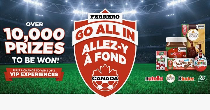 The Ferrero – Go All In To Win Contest offers Canadians the chance to win a VIP Canada Soccer experience or instant prizes by submitting receipts or stories about Ferrero products.