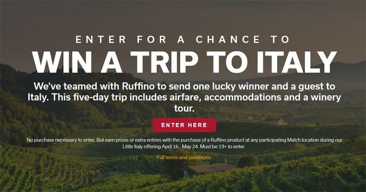 The Ruffino Little Italy Giveaways by Gateway Casinos & Entertainment Limited offers 72 prizes, including a grand trip to Italy.